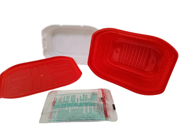 Двухярусный пластиковый контейнер для разогрева продукта беспламенным способом. Посмотрите как это работает в видео ниже: